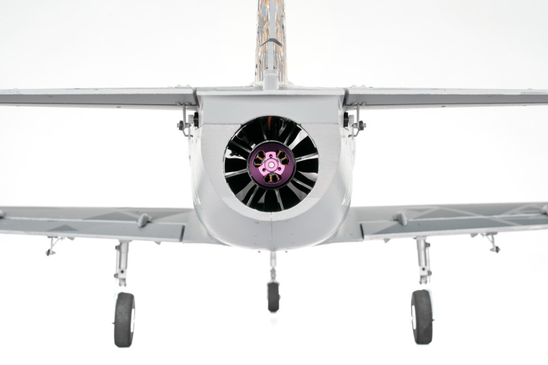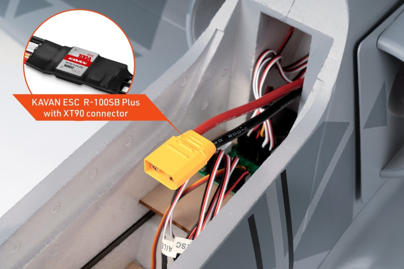 Der Rumpf des Modells besteht aus dem hochbeständigen EPO-Schaum (extrudiertes Polyolefin) mit festen inneren Kohlefaser-Verstärkungen. Im hinteren Teil des Rumpfes ist ein 80 mm Impeller mit einem Brushless-Elektromotor C3552-2000, Regler KAVAN R-100SB Plus und leistungsstarkem BEC eingebaut, das für die Stromversorgung von 8 Servos an Bord benötigt wird. Der Zugang zum Impeller und Motor erfolgt über einen abnehmbaren oberen Leitwerksträger (inkl. Leitwerke), der mit Schrauben befestigt wird. Die Kabinenabdeckung ist abnehmbar und wird vorne mit einem Stift und hinten mit einem mechanischen Riegel gesichert. Im Kabinenraum finden Sie genug Platz für einen Antriebsakku und einen Empfänger.