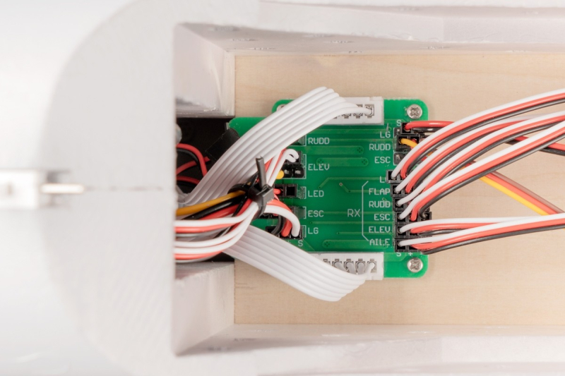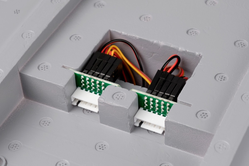 Zur Steuerung des Modells können Sie auch ein 6-Kanal-Computer-RC-Set ohne Sonderfunktionen verwenden – in der Basisversion werden die Querruder, Klappen, das Seitenruder, Höhenruder und das Servo des Bugbeins über eine Anschlussplatte im Kabinenraum immer nur an einen Kanal angeschlossen. Die Platte sichert auch die Stromversorgung von LED-Lichtern. Der angeschlossene Sequenzer sorgt für die Steuerung des Einziehfahrwerks. In der Anleitung gibt es natürlich auch eine ausführliche Tabelle mit einer bewährten Standardeinstellung der Ruderausschläge, damit Sie L-39 einfach zum Flug vorbereiten, auch wenn es Ihr erstes Modell mit „Vollmechanisierung“ des Flügels ist.
